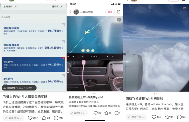 另一個明顯標志就是,在微博、小紅書等平臺,曬出自己在飛行途中通過空中WIFI上網(wǎng)打卡圖文/短視頻的相關(guān)帖子悄然增加。