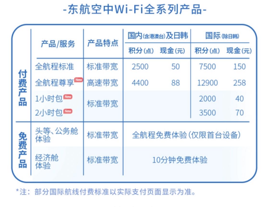 在資費方面,以東航空中WIFI日常價格為例,劃分為免費和付費兩大類產(chǎn)品。免費空中WIFI每位乘客都可以有10分鐘的額度;國內(nèi)及日韓付費空中WIFI全航程是50元,國際付費空中WIFI全航程是150元。