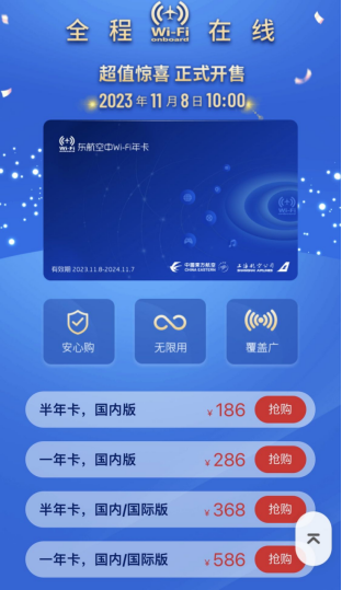 好在航司也很精明,今年東航就借“雙11”推出空中WIFI半年卡和年卡產(chǎn)品,把空中WIFI的價格進一步壓下來。根據(jù)東航規(guī)定,國內(nèi)版半年卡/一年卡分別是186元/286元,國內(nèi)/國際版半年卡/一年卡分別是368元和586元。