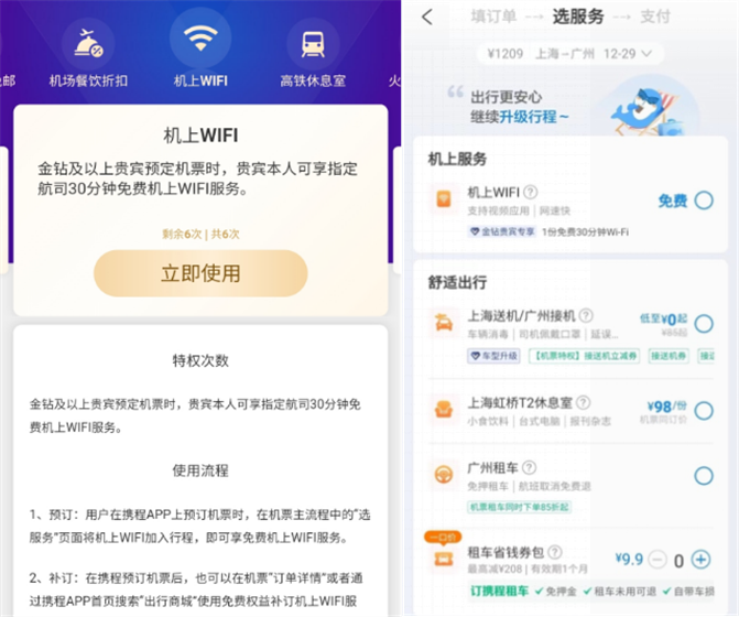 攜程的金鉆和黑鉆會員在攜程平臺上訂購東航和吉祥寬體機執(zhí)飛的航班機票時,在機票主流程中的“選擇服務”頁面,出現(xiàn)了“免費的機上Wi-Fi”字樣,點擊后可以選擇30分鐘的免費使用空中Wi-Fi權(quán)益。根據(jù)攜程的計劃,每位黑鉆和金鉆會員在年內(nèi)分別有12次和6次在東航和吉祥的飛機上免費使用空中Wi-Fi的機會,不管是國內(nèi)還是國際航線都可以。