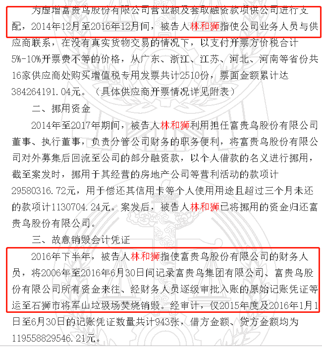 此外,林和獅還指使富貴鳥(niǎo)旗下業(yè)務(wù)人員非法購(gòu)買(mǎi)增值稅專(zhuān)用發(fā)票。僅2014年12月至2016年12月間,富貴鳥(niǎo)就從廣東、浙江、江蘇、河北、河南等省16家供應(yīng)商購(gòu)買(mǎi)增值稅專(zhuān)用發(fā)票2510份,票面金額約3.84億元。