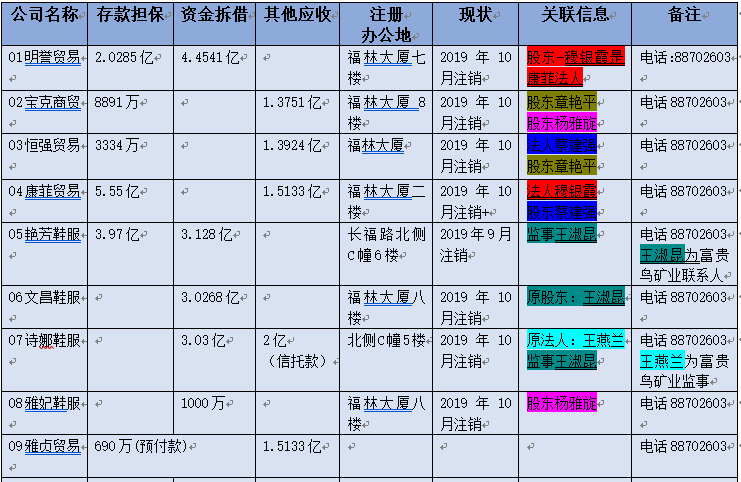 不僅是登記電話一致,在人員方面,8家商貿(mào)公司之間,以及與富貴鳥(niǎo)的明面關(guān)聯(lián)公司之間,也存在多重交集,如: