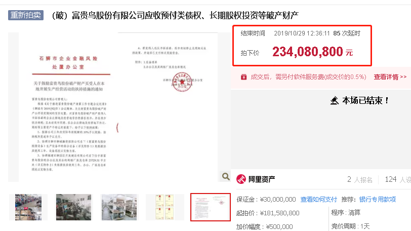 2019年8月23日,福建泉州中院裁定富貴鳥(niǎo)股份破產(chǎn),富貴鳥(niǎo)的商標(biāo)等無(wú)形資產(chǎn)、存貨、應(yīng)收賬款、股權(quán)投資等被打包放到阿里司法拍賣(mài)平臺(tái)上。這些資產(chǎn)經(jīng)歷兩次流拍之后,2019年10月29日,第三次起拍價(jià)降到了1.81億元。這一次出現(xiàn)了兩家爭(zhēng)奪者,從上午9點(diǎn)53分開(kāi)始,一直爭(zhēng)搶到了中午12點(diǎn)31分,經(jīng)過(guò)85次競(jìng)價(jià),最終以2.34億元的價(jià)格成交,比起拍價(jià)高出了超過(guò)5000萬(wàn)元。