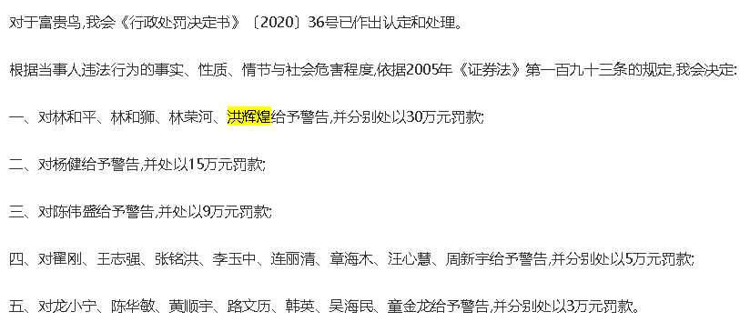 而在證監(jiān)會(huì)2021年9月7日發(fā)布的對(duì)涉富貴鳥(niǎo)事件的21人處罰名單中,洪輝煌作為富貴鳥(niǎo)債券多份年報(bào)信披違法、債券發(fā)行時(shí)存虛假記載和重大遺漏的直接主管人員之一,與林和平、林和獅、林榮河一起被證監(jiān)會(huì)給予警告,并分別處以30萬(wàn)罰款。
