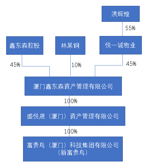 因此,在富貴鳥(niǎo)的資產(chǎn)拍賣(mài)兩個(gè)月后(2019年12月23日),到2020年8月28日(悅一誠(chéng)將鑫東森資產(chǎn)的45%股權(quán)轉(zhuǎn)讓給鑫東森控股)之前,洪輝煌實(shí)際是新富貴鳥(niǎo)的第一大股東(并列),具體控股情況可見(jiàn)以下關(guān)系圖。