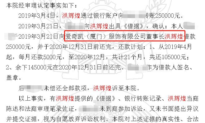其次,2018年8月,太田商貿(mào)發(fā)生人員變更,執(zhí)行董事兼總經(jīng)理變更為洪某加。天眼查顯示,洪某加當(dāng)前為愛(ài)奇凱服飾有限公司股東和法人代表。而據(jù)幾份司法文書(shū)顯示,愛(ài)奇凱公司2019年3月時(shí)的董事長(zhǎng),又是洪輝煌,愛(ài)奇凱公司的原股東張某,是洪輝煌的親屬,愛(ài)奇凱本身應(yīng)屬洪輝煌的關(guān)聯(lián)方公司,因此,太田商貿(mào)背后的洪某加與洪輝煌,在愛(ài)奇凱公司層面發(fā)生了聯(lián)系。