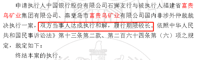 盡管富貴鳥(niǎo)股份破產(chǎn)時(shí),富貴鳥(niǎo)礦業(yè)也官司纏身,存在多個(gè)被執(zhí)行的案件,但從近兩年的一系列裁判文書(shū)顯示,富貴鳥(niǎo)礦業(yè)已與多個(gè)債權(quán)人達(dá)成了和解協(xié)議。