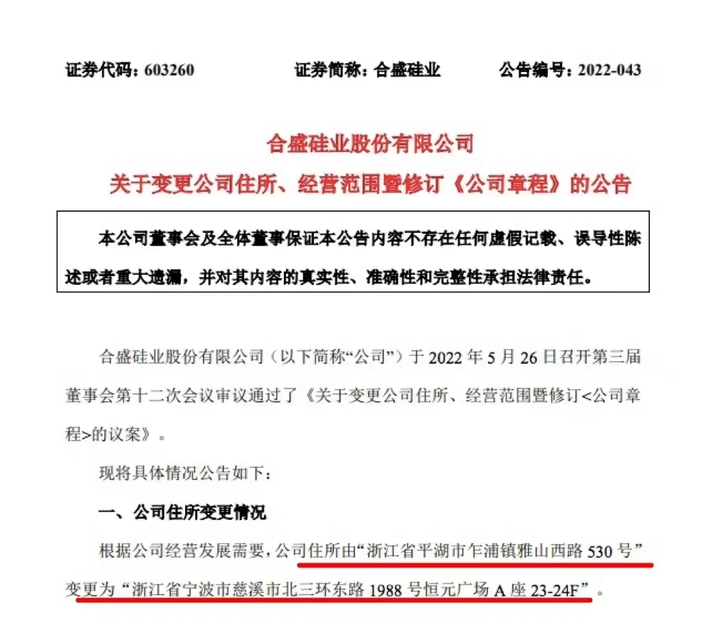 2022年5月28日,合盛硅業(yè)公告稱公司向股東大會提交議案,公司住所將由浙江省平湖市搬遷至浙江省寧波市(編者按:平湖市隸屬于浙江省嘉興市)。