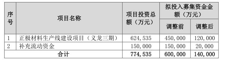 其中,正極材料生產(chǎn)線建設(shè)項(xiàng)目(義龍三期)募集資金金額從45億元調(diào)整為12億元,補(bǔ)充流動(dòng)資金規(guī)模從15億元調(diào)整為2億元,整體定增規(guī)模調(diào)減超過(guò)七成。