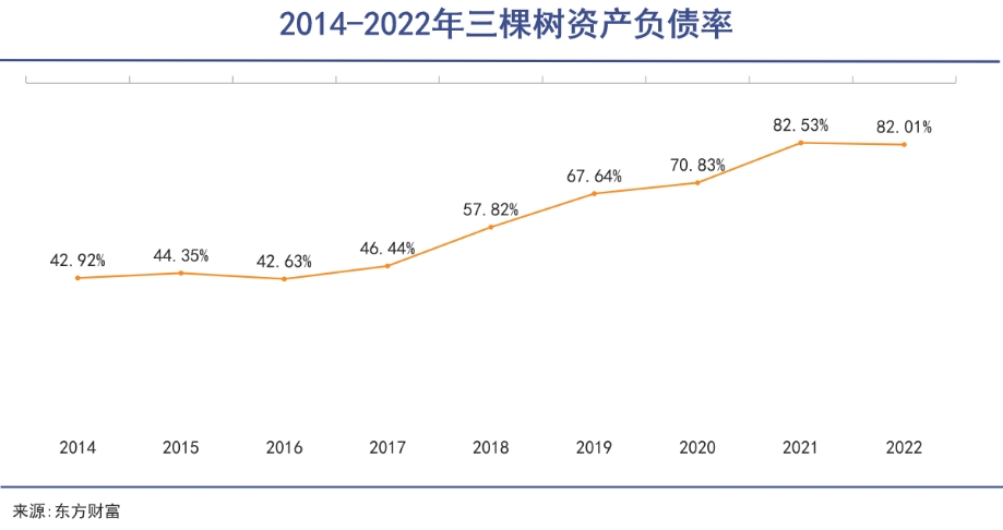 一方面錢收不回來,但另一方面?zhèn)鶆盏膲毫τ衷絹碓酱螅?014年,三棵樹的資產負債率僅僅為42.92%;2022年,已飆升至82.0%;到2023年雖然稍有緩解,仍有79.98%。