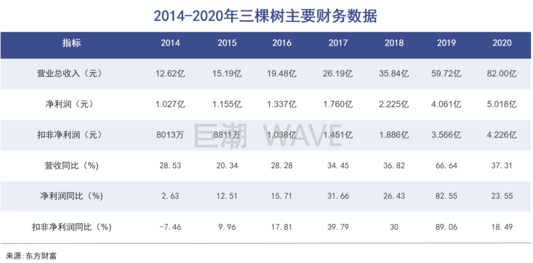 縱觀三棵樹目前公布的業(yè)績報告。從2014年以來,三棵樹不論從營收還是凈利潤來說,都呈現出“撐桿跳式”的爆發(fā)情況。