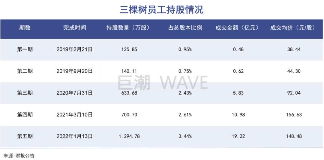只不過股價升得快,落得也快。從2021年觸及歷史高點以來,三棵樹的股價至今腰斬有余。目前其股價不足60元,而員工持股的價格普遍都高于80元,第五期持股成本甚至有超過百元的。