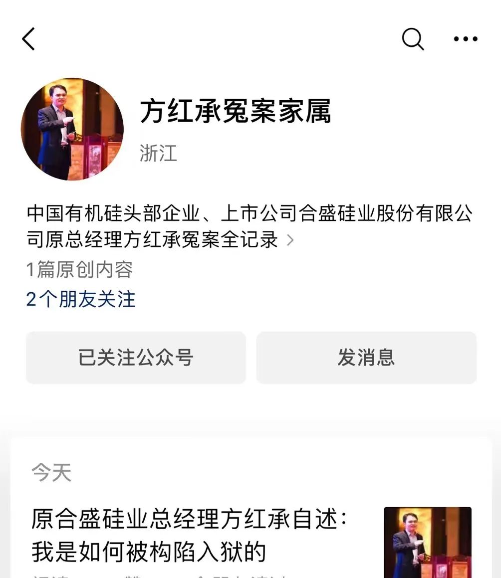 合盛硅業(yè)公告稱,方紅承涉嫌非國家工作人員受賄罪、職務(wù)侵占罪;而方紅承家屬稱方紅承是被“構(gòu)陷入獄”。