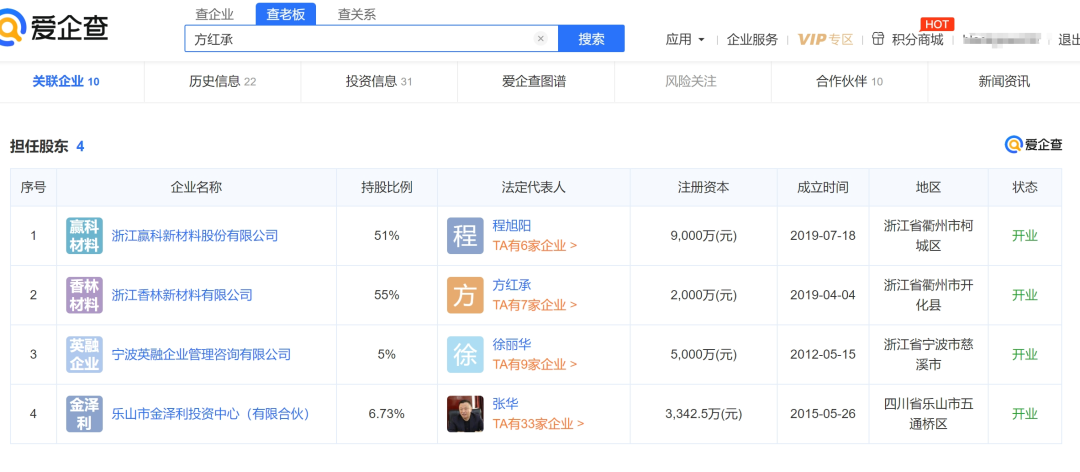 對比之下,方紅承在來到合盛前,基本是在浙江新安化工集團營銷部門工作,創(chuàng)業(yè)經(jīng)歷集中于離開合盛后。目前其在4家公司有持股,整體來看還是專注于化工行業(yè)。