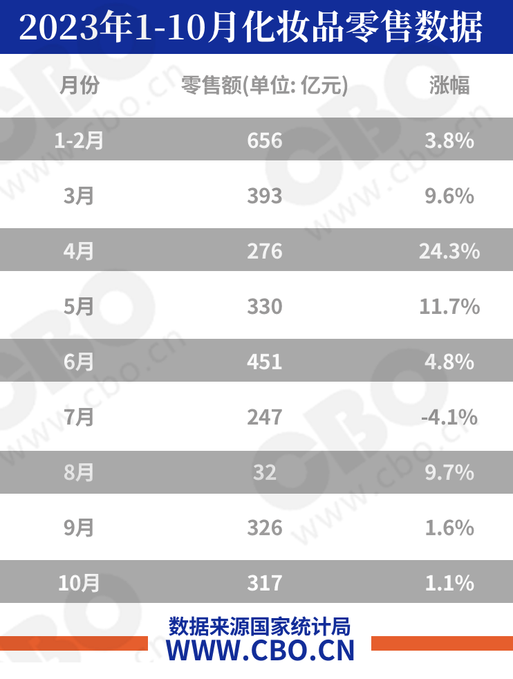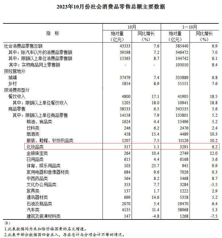 化妝品零售數(shù)據(jù)方面,1-10月份總零售額為3291億元,同比上漲6.2%。10月份單月零售額為317億元,同比上漲1.1%,增速低于大盤,且環(huán)比9月下滑2.8%。