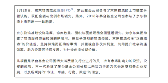 “商而優(yōu)則投”,茅臺也不例外。2021年5月28日,京東物流IPO后貴州茅臺官方公眾號發(fā)文稱茅臺基金參與了京東物流上市前唯一的一輪融資。