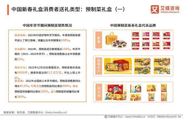 預(yù)制菜當(dāng)然不甘心只出現(xiàn)在打工人的餐桌上,逐漸的,禮品市場(chǎng)、旅游市場(chǎng)都成了預(yù)制菜的目標(biāo)場(chǎng)景。2022年,同程旅行與南國(guó)食品跨界合作,推出夏日出游禮盒,線上限量銷(xiāo)售10萬(wàn)盒;《2023年中國(guó)新春禮盒消費(fèi)者行為洞察報(bào)告》中提到,預(yù)制菜(23.4%)成為中國(guó)消費(fèi)者新春送禮的新選擇,首次登上新春禮盒前十選擇類(lèi)型榜單。