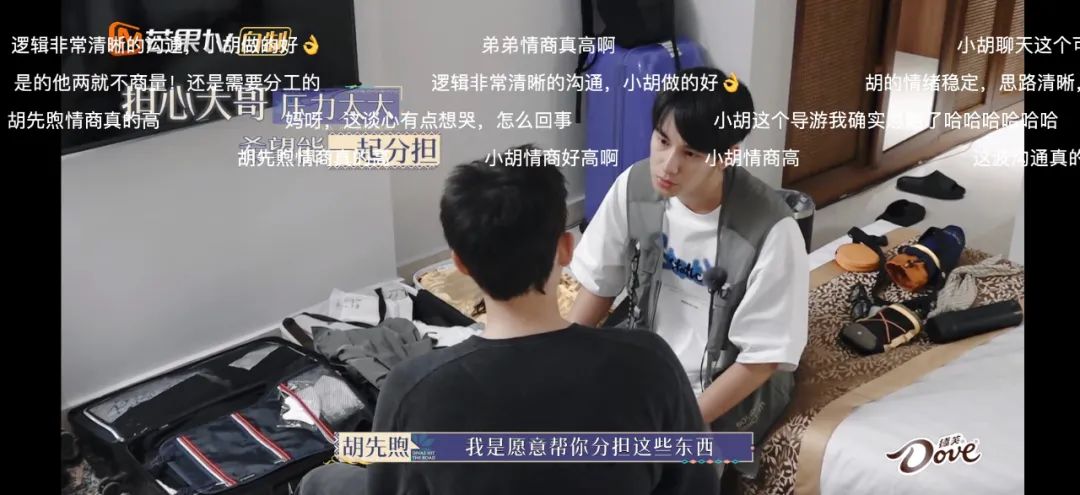 王安宇與胡先煦,兩男導(dǎo)游“勾心斗角”,是《花少5》前期最接近老花學的沖突話題。豈料,看了正片觀眾才恍然,這兩男的是遇事就解決,安宇發(fā)現(xiàn)了問題就及時找小胡溝通、小胡則情理兼?zhèn)淠托拈_導(dǎo),這段“胡先煦安慰隊友免費情商課”建議大家拉片觀看至少3遍以上。