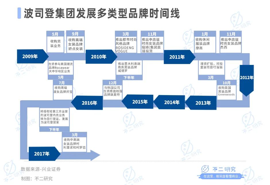 2009年,波司登收購波司登男裝,正式開啟四季化、多品牌擴張征程。此后,波司登不斷通過收購拓展四季化版圖。