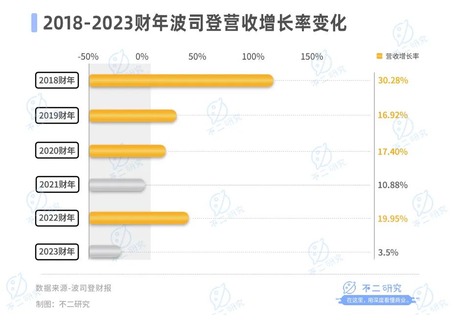 據波司登財報顯示,波司登2018-2023財年的營收增長率分別為30.28%、16.92%、17.40%、10.88%、19.95%。盡管2021財年波司登的營收增長率大跌至10.88%,較2018財年下降19.40個百分點,但2023財年實現(xiàn)收入約167.74億元,同比增加3.5%,這一同比增速創(chuàng)下波司登近7年以來新低。