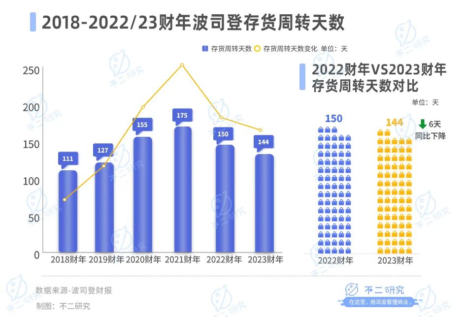 據波司登財報顯示,2018-2022財年,其存貨周轉天數(shù)由111天增至150天。據波司登2022/2023財年報告顯示,截至2023年3月31日,波司登存貨周轉天數(shù)達到144天,同比下降6天。