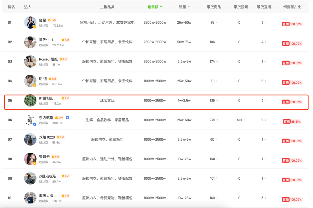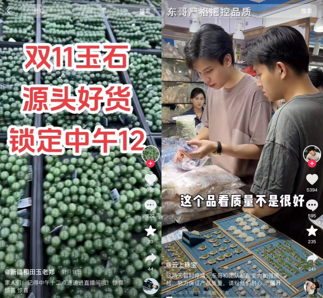 抖音的“新疆和田玉老鄭”“云上珠寶”,淘寶的“千葉珠寶”,小紅書(shū)的“宋府-高端珠寶”“町綺珠寶”等直播間多次登上平臺(tái)全品類銷(xiāo)售額的TOP10。