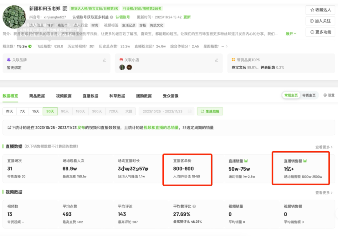 而上述垂類直播間的轉(zhuǎn)化,甚至更優(yōu)于這些大主播,新疆和田玉老鄭就以115萬(wàn)粉絲卻撬動(dòng)了146萬(wàn)的銷(xiāo)量,他是如何做到的?