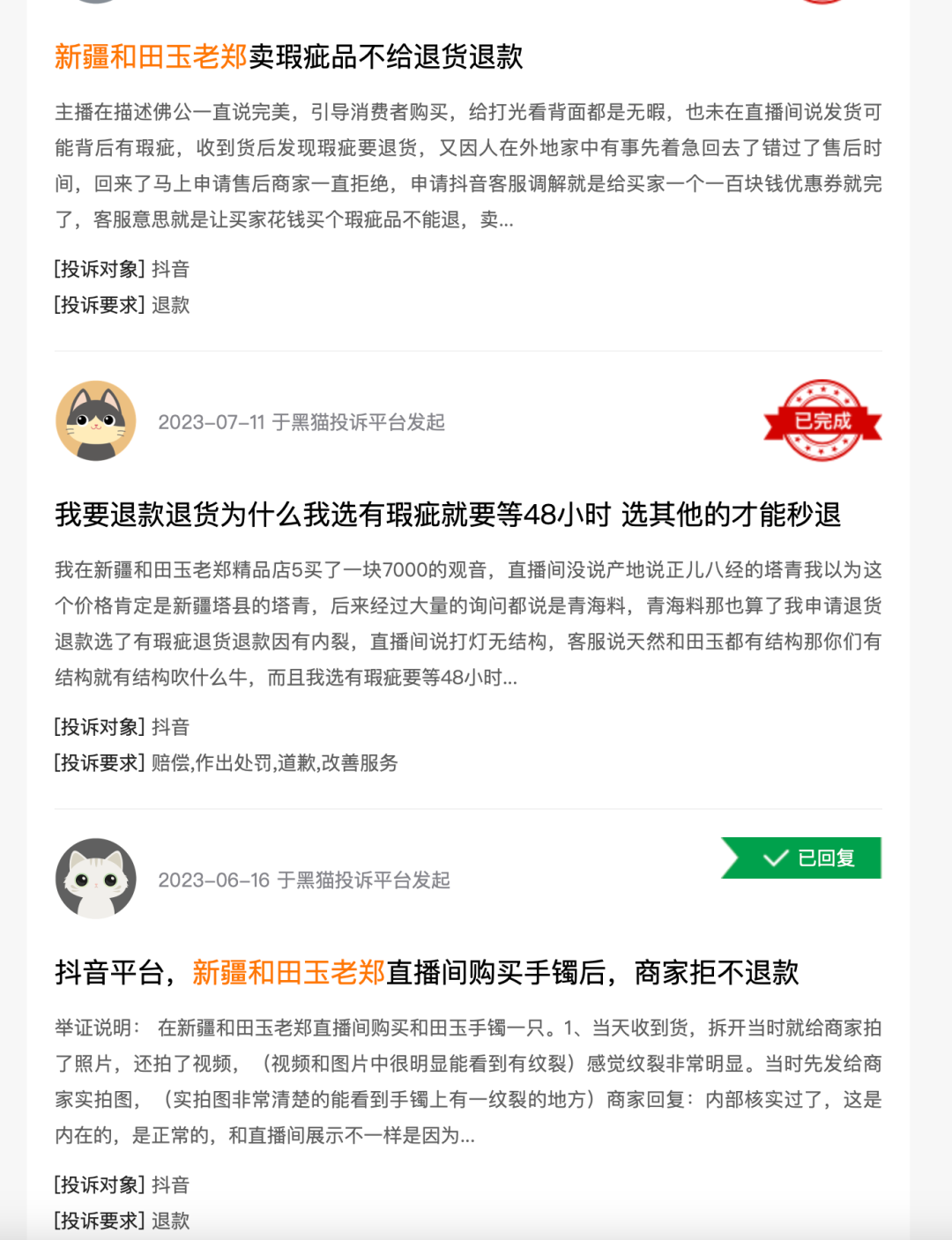 有用戶稱,自己在新疆和田玉老鄭直播間購(gòu)買(mǎi)價(jià)值1萬(wàn)元手鐲,收到貨后發(fā)現(xiàn)肉眼難以看到的多處暗裂,并且多名用戶都表示自己退貨后,商家以各種理由拒絕退款。