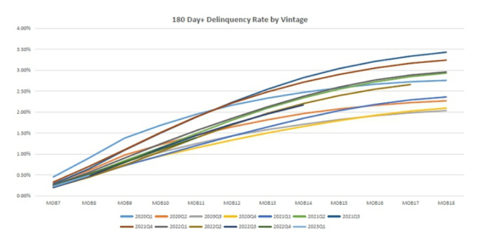 比如2020年一季度所放貸款,經(jīng)過一年時間后,逾期率維持在7%以上;而2023年一季度所放貸款,逾期率雖有所下降,但M6+逾期率也維持在0.5%—1%之間。