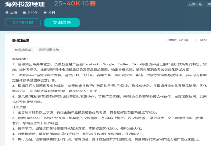 在某投放平臺中,公司對海外投放經(jīng)理開出了37.5—60萬元的年薪。該崗位任職集團(tuán)海外事業(yè)部,負(fù)責(zé)各金融產(chǎn)品在Facebook、Google、Twitter、Tiktok等主流平臺上的廣告投放策略的制定、實施、維護(hù)及調(diào)優(yōu);定期調(diào)研海外市場投放趨勢及競品投放策略,輸出分析文檔,提供市場洞察及各類優(yōu)化測試方案。要求“有類金融產(chǎn)品投放經(jīng)驗優(yōu)先考慮,具備較好的英語聽說讀寫能力”等。