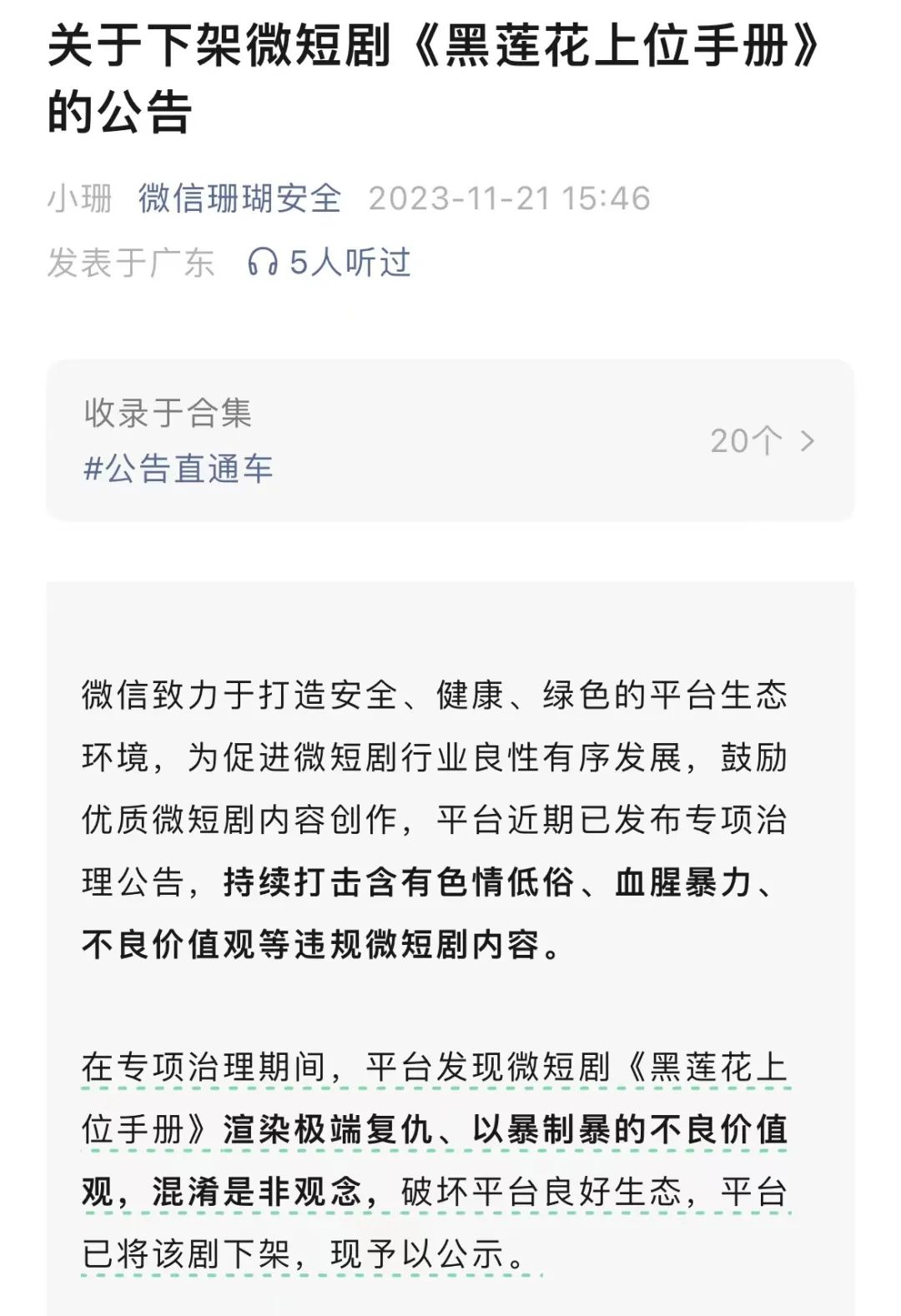 11月21日,微信珊瑚安全公眾號(hào)發(fā)布一則公告,宣布下架微短劇《黑蓮花上位手冊(cè)》(以下簡(jiǎn)稱《黑蓮花》)。對(duì)此,該公告解釋道:“《黑蓮花》渲染極端復(fù)仇、以暴制暴的不良價(jià)值觀,混淆是非觀念。”就在微信出手整治的同時(shí),《黑蓮花》也從快手和抖音平臺(tái)上消失。
