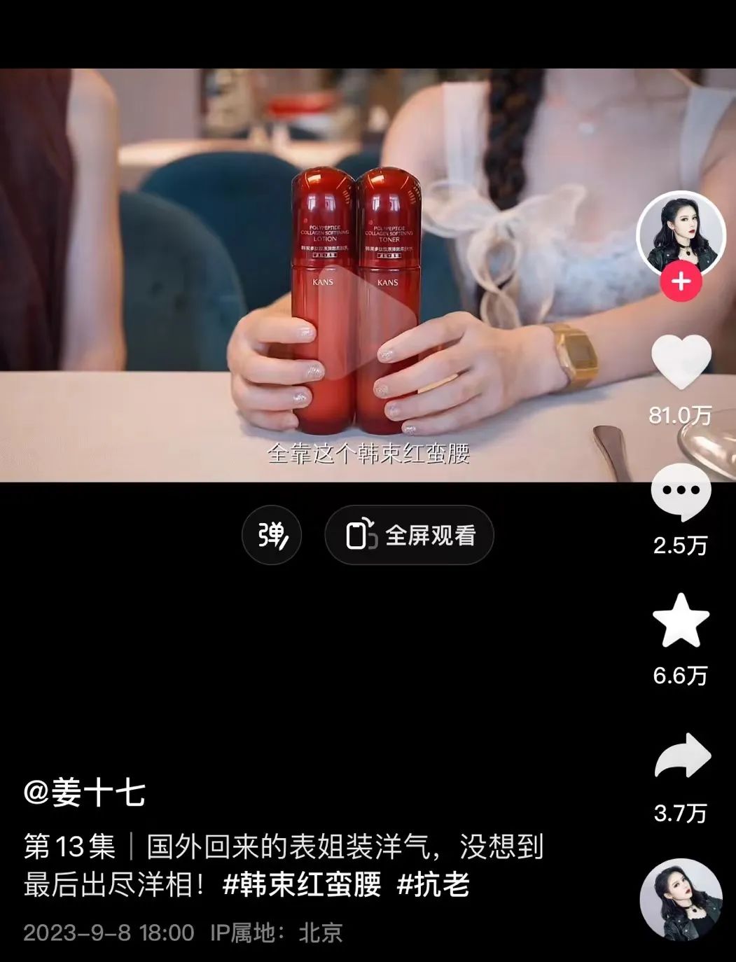 其中,僅在今年上半年,韓束就冠名了3部短劇,抖音播放量共計(jì)30.6億。巨大的流量也轉(zhuǎn)化成為客觀的銷量,據(jù)悉,數(shù)度在短劇中露出的韓束“紅蠻腰”系列護(hù)膚品,全渠道銷量超150萬套。
