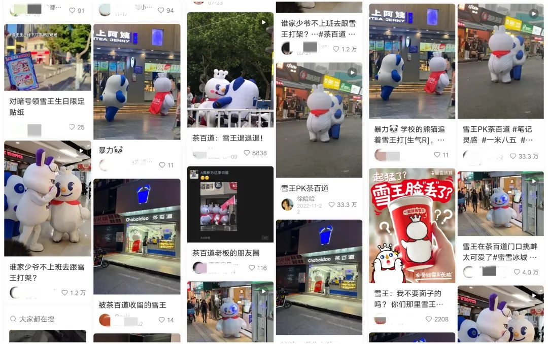 比如“雪王在茶百道門口挑釁”“下雨天抓到一只溜去隔壁茶百道串門的雪王”等搞笑視頻鋪天蓋地。
