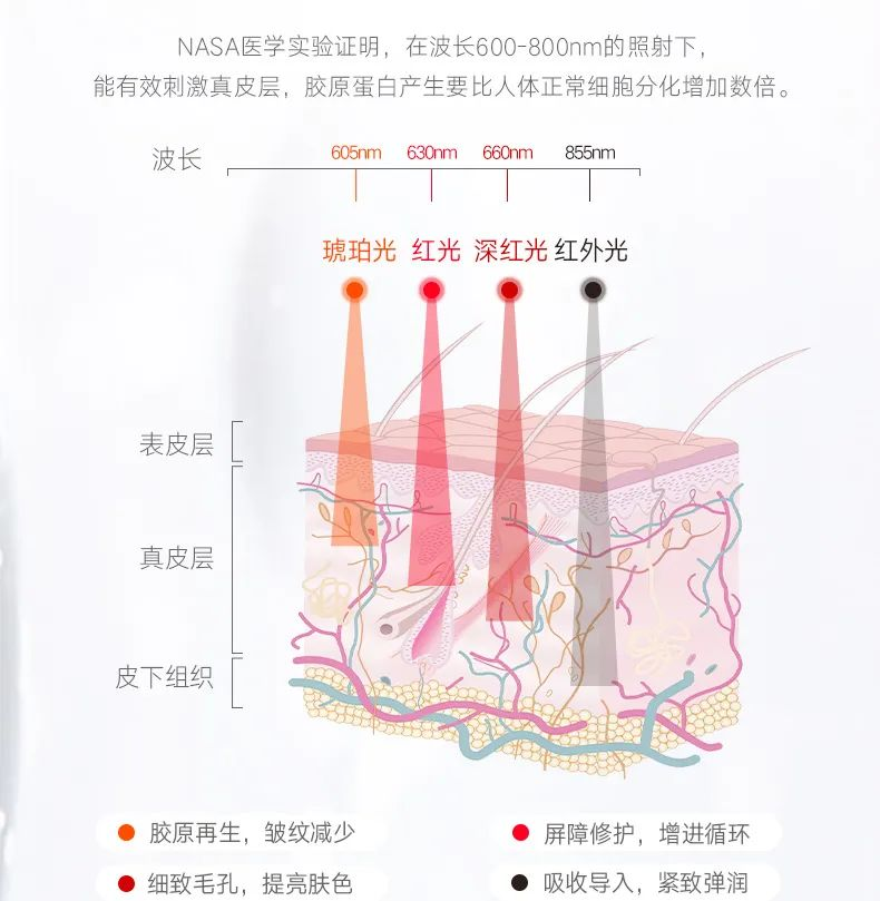 NASA在研究報(bào)告指出,特定波長(zhǎng)的光可以轉(zhuǎn)化為細(xì)胞能,與人體組織線粒體的吸收譜產(chǎn)生共振,加快酶促反應(yīng),促進(jìn)細(xì)胞的新陳代謝。