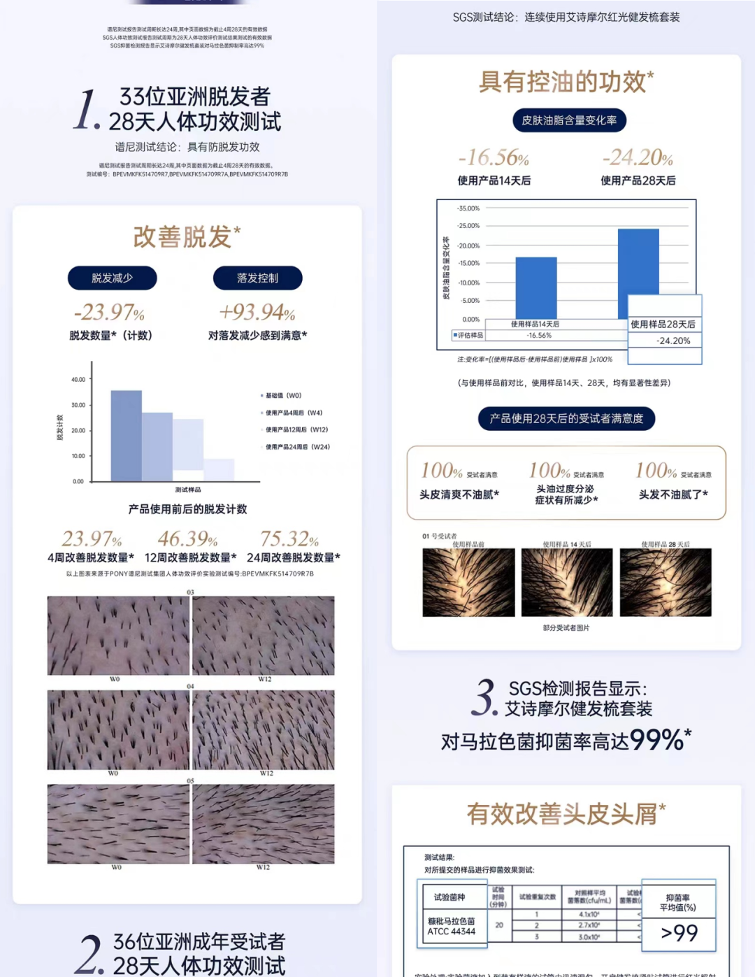天貓上月銷(xiāo)量1w+的艾詩(shī)摩爾紅光健發(fā)梳(售價(jià)2999元),據(jù)稱(chēng)使用了12束低能量溫?zé)峒t光以及復(fù)合微電流,主打“科技養(yǎng)發(fā),控油防脫”。并且該品牌還在天貓?jiān)斍轫?yè)上展示了完整的臨床人體試驗(yàn)報(bào)告,以及相關(guān)科技專(zhuān)利名稱(chēng),看上去有些不明覺(jué)厲。