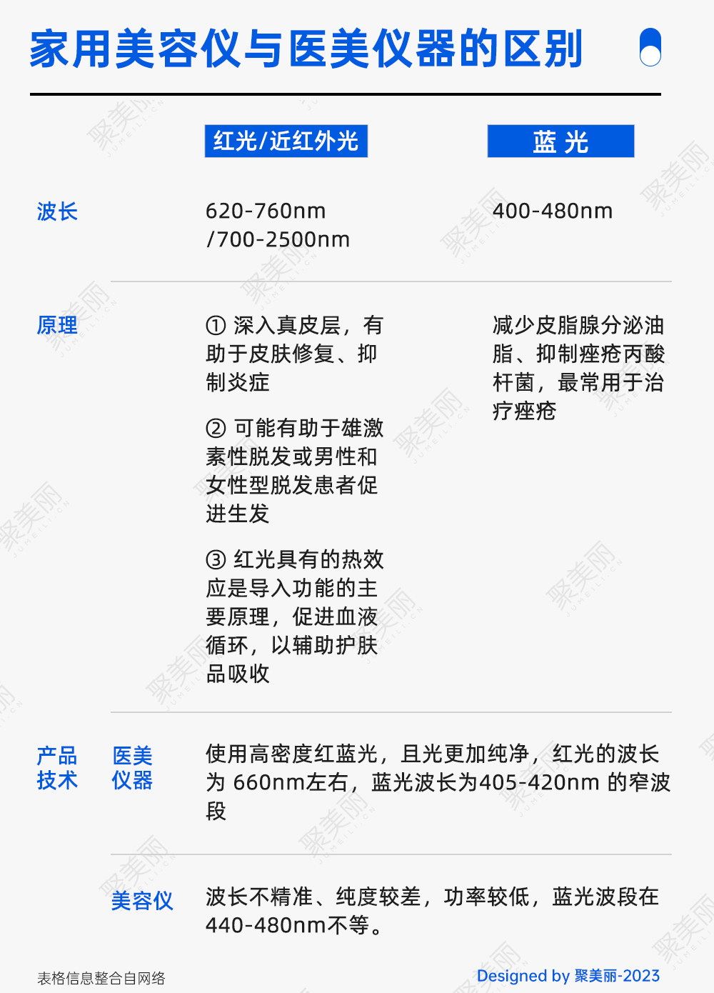 在美容儀功能中,紅藍(lán)光相對(duì)來(lái)說(shuō)功效機(jī)制較為明確,其來(lái)源于醫(yī)美和臨床的紅藍(lán)光聯(lián)合治療。據(jù)了解,醫(yī)美項(xiàng)目中所使用的儀器均為高密度的紅藍(lán)光,藍(lán)光是波長(zhǎng)為 405-420nm 左右的光源,而紅光的波長(zhǎng)為 660nm 左右,兩者都是窄譜光源發(fā)出的冷光,不會(huì)產(chǎn)生熱,且不灼傷皮膚。