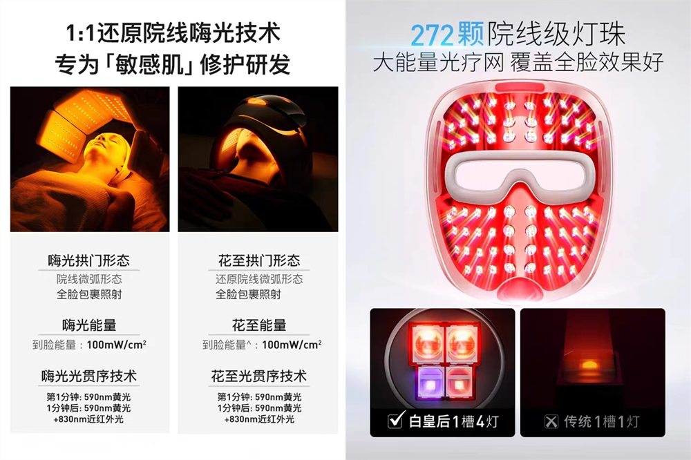 比如,國(guó)內(nèi)新銳美容儀品牌花至推出的面罩型產(chǎn)品光能艙(售價(jià)4999元),宣稱(chēng)功效為抗老、美白、舒緩、修護(hù)的四合一,據(jù)稱(chēng)其能夠維持590nm的黃光以及830nm的近紅外光;Ulike的白皇后面罩(售價(jià)3299元)也宣稱(chēng)使用了院線級(jí)科技,其中采用藍(lán)光(415nm)、黃光(590nm)、紅光(630nm)和近紅外光(830nm)四種光源,主打亮膚緊致、控痘修護(hù)的復(fù)合功能。