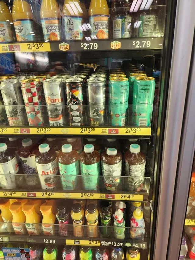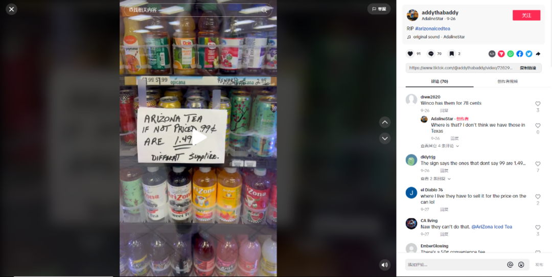 先是美國的一些零售商開始坐不住了。在TikTok上,美國網(wǎng)友反映,有零售商為了多賺取一點(diǎn)利潤,對(duì)AriZona罐裝冰茶“坐地起價(jià)”,罐身上的99美分標(biāo)志,被強(qiáng)行用一張2.99美元的價(jià)格標(biāo)簽覆蓋。甚至還有零售商更簡單粗暴地在冰柜的玻璃門上,貼上一張寫有“AriZona冰茶不賣99美分,賣1.49美元”的告示。目前坐地起價(jià)的現(xiàn)象主要存在于個(gè)體戶,但也有網(wǎng)友發(fā)現(xiàn),在美國連鎖便利店Circle K,AriZona的價(jià)格也被調(diào)整到了1.29美元。