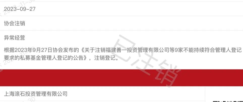 “根據(jù)2023年9月27日協(xié)會(huì)發(fā)布的《關(guān)于注銷福建善一投資管理有限公司等9家不能持續(xù)符合管理人登記要求的私募基金管理人登記的公告》,注銷登記?!?/p>