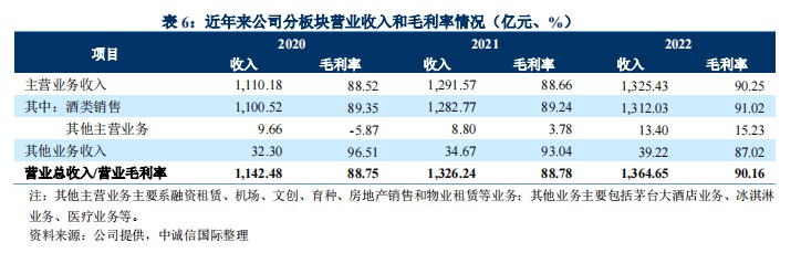 2022年,茅臺文旅業(yè)務迎來關鍵的轉折點。根據(jù)中誠國際發(fā)布的跟蹤報告,2022 年茅臺文旅業(yè)務實現(xiàn)營業(yè)收入和凈利潤 10.26 億元和 1.7 億元,同比分別大幅增長 372.76%和 475.64%。其中,文創(chuàng)、物業(yè)等被列為茅臺集團其他主營業(yè)務,2022年收入13.4億元,同比增長52%;茅臺大酒店、冰淇淋等被列為其他業(yè)務,2022年收入39.22億元。