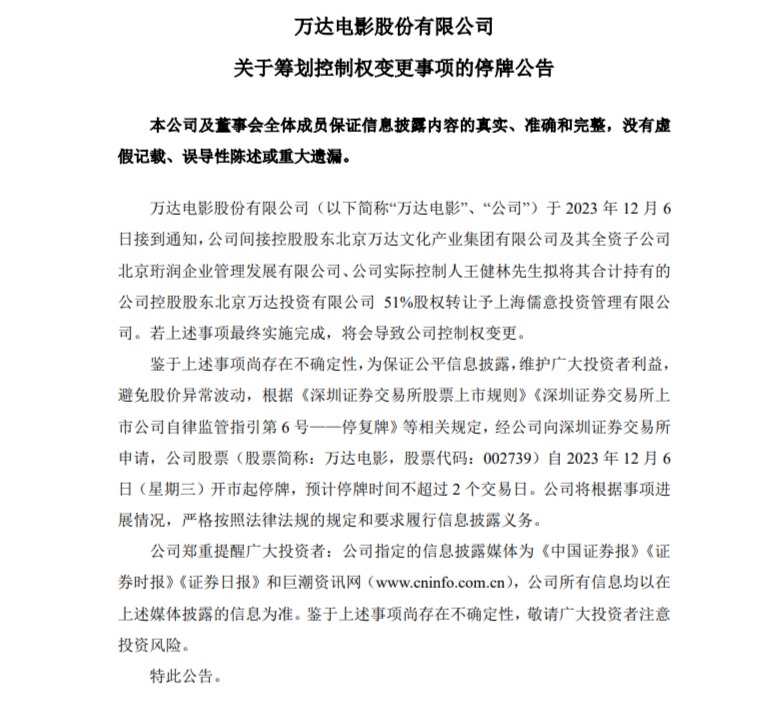12月6日,萬達電影于早間發(fā)布公告,公司擬籌劃控制權(quán)變更事項。