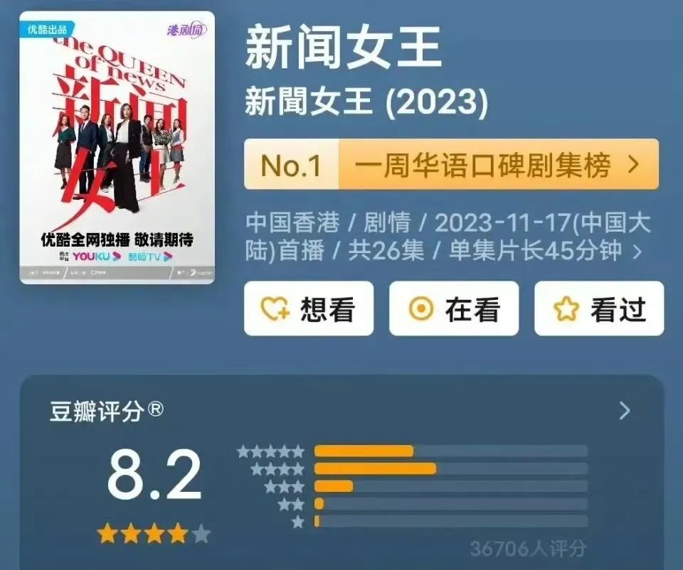 該劇在優(yōu)酷獨家上線后的10天內(nèi),就獲得了超過10億的播放量,創(chuàng)造了新的紀錄,截至12月5日。微博討論量超45萬,豆瓣評分8.2。在香港地區(qū),《新聞女王》第一集電視首播最高收視率達23.4點,和TVB上半年收視冠軍《隱形戰(zhàn)隊》旗鼓相當,足以稱得上口碑熱度雙豐收。