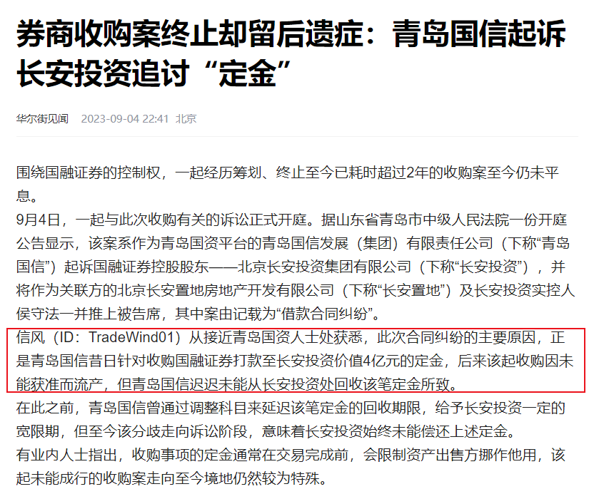 新媒體“信風(fēng)”從接近青島國資人士核實(shí),此次借款合同糾紛的主要原因,正是青島國信昔日針對(duì)收購國融證券打款至長安投資價(jià)值4億元的定金,后來該起收購因未能獲準(zhǔn)而流產(chǎn),但青島國信遲遲未能從長安投資處回收該筆定金所致,如今這起收購走向訴訟階段,意味著長安投資始終未能償還上述定金。