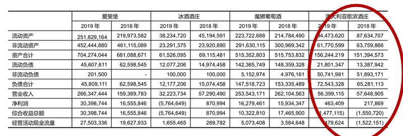 此外,2018年歌濃酒莊實現(xiàn)營收5764.89萬元,凈利潤僅21.79萬元;2019年歌濃酒莊實現(xiàn)營業(yè)收入5639.91萬元,凈利潤也只有46.34萬元。
