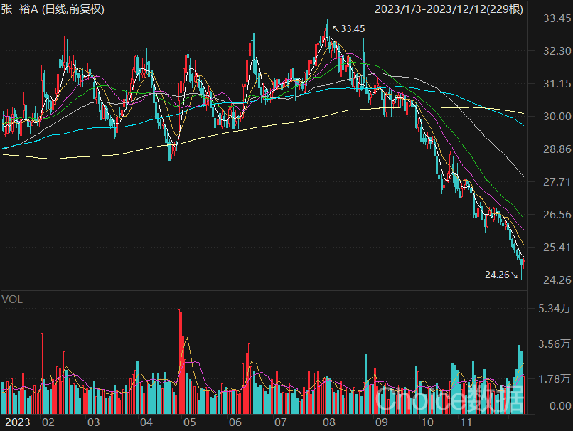 從二級市場來看,張裕A股價自今年8月以來一路向下,并于12月11日創(chuàng)下24.26元/股的近一年半以來的新低。截至12月12日收盤,張裕A報24.95元/股,較前期33.45元/股的高點累計下跌超25%。