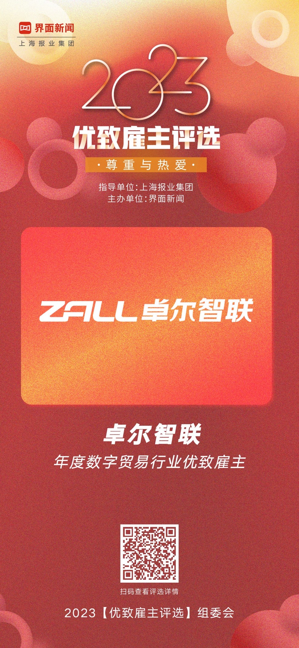 12月13日,上海報(bào)業(yè)集團(tuán)l界面新聞在上海中心舉辦了2023【優(yōu)致雇主評(píng)選】頒獎(jiǎng)典禮,隆重公布本年度上榜企業(yè)。圍繞尋找和評(píng)選最佳雇主這一責(zé)任旨?xì)w,以獨(dú)立客觀立場,通過專業(yè)科學(xué)的調(diào)查和評(píng)估體系,洞察求職者的需求變化,同時(shí)為求職者發(fā)現(xiàn)“好雇主”提供有效參考,實(shí)現(xiàn)雇主與雇員的“雙贏”,各行各業(yè)的優(yōu)秀企業(yè)均踴躍參加。卓爾智聯(lián)憑借創(chuàng)新的企業(yè)文化和管理模式以及可持續(xù)發(fā)展理念,榮膺2023【優(yōu)致雇主評(píng)選】年度數(shù)字貿(mào)易行業(yè)優(yōu)致雇主。