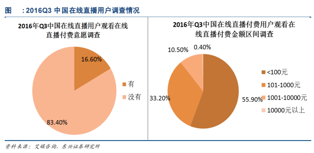 據(jù)艾媒咨詢數(shù)據(jù),2016Q3,雖然僅有16.6%的用戶觀看直播時(shí)有打賞意愿,但這部分付費(fèi)用戶中,有55.9%的用戶打賞金額在100元以下,這說(shuō)明兩個(gè)問(wèn)題:
