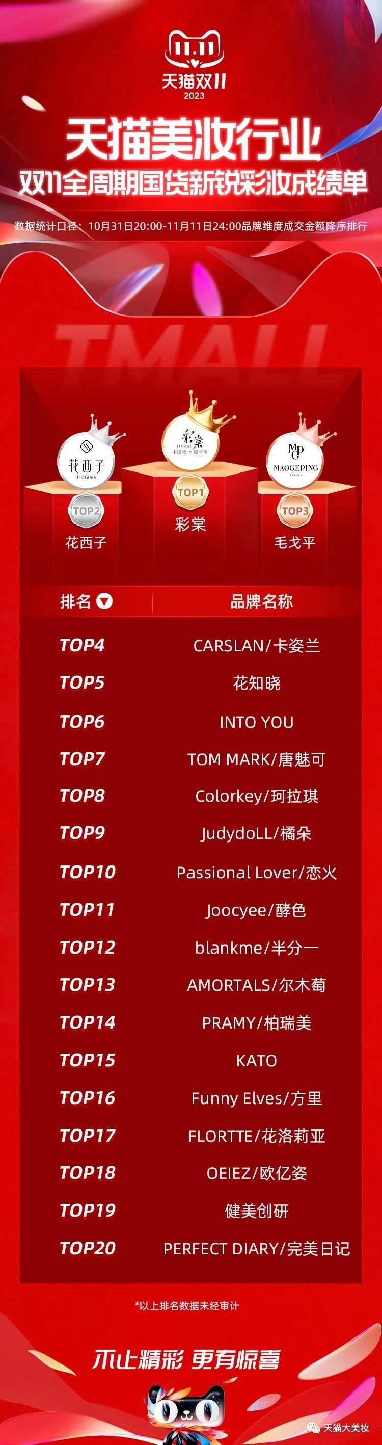 TOP 20中,除了我們在上文中反復(fù)提及的完美日記、花西子,今年特別亮眼的包括彩棠、毛戈平、花知曉、INTO YOU、橘朵、戀火、酵色、方里等。