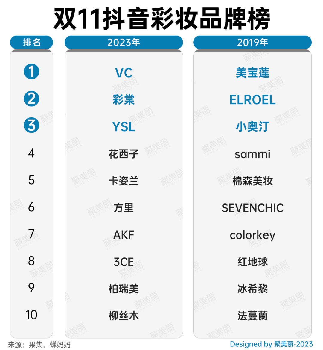 與護(hù)膚賽道的競爭相似,彩妝的競爭也越來越進(jìn)入規(guī)?;偁幍能壍乐小N覀儊砜唇衲晏熵堧p11的彩妝榜單: