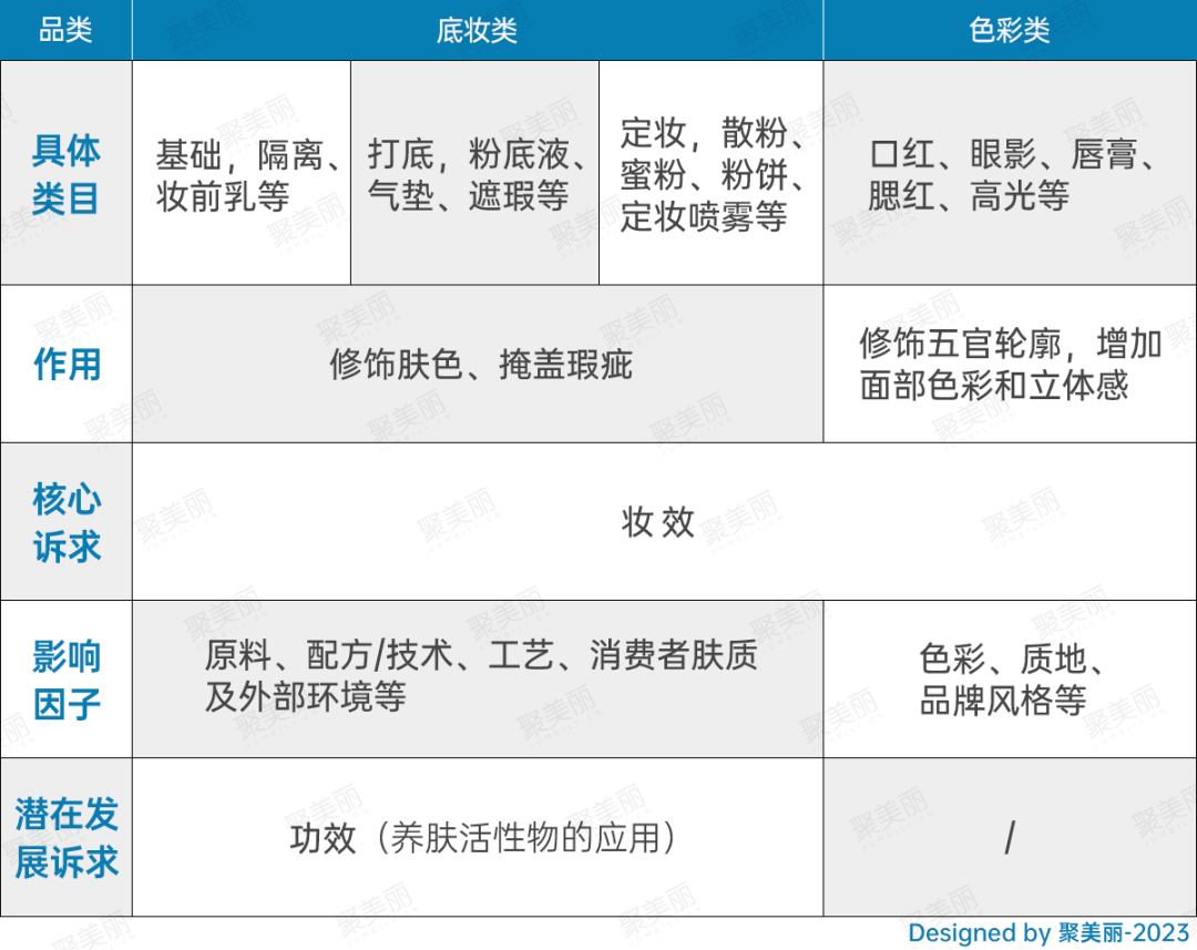 再回到彩妝品類本身,底妝類與色彩類,一個(gè)理性成分更濃一些,一個(gè)感性成分占主導(dǎo),所以兩大細(xì)分品類在產(chǎn)品對消費(fèi)者的影響因子層面也有區(qū)別。